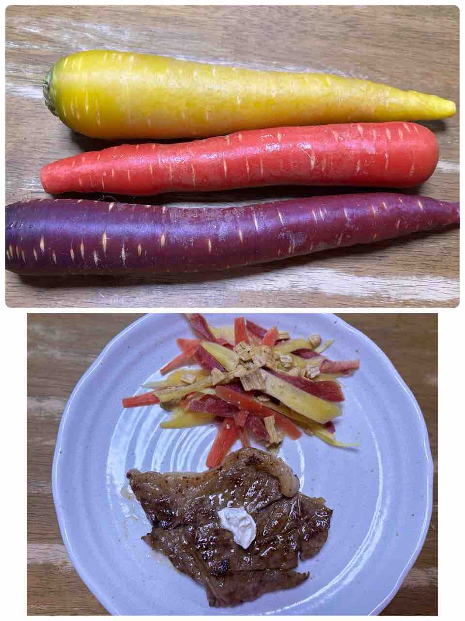 2026年01月13日 ポニーメイツさんからのお裾分け カラフル人参🥕頂きました❣️生で食べられると聞き付け合わせに。(スーパーで思いの外お手頃になっていたステーキ🥩なんか買っちゃったんで😸) カテゴリなしの他の記事